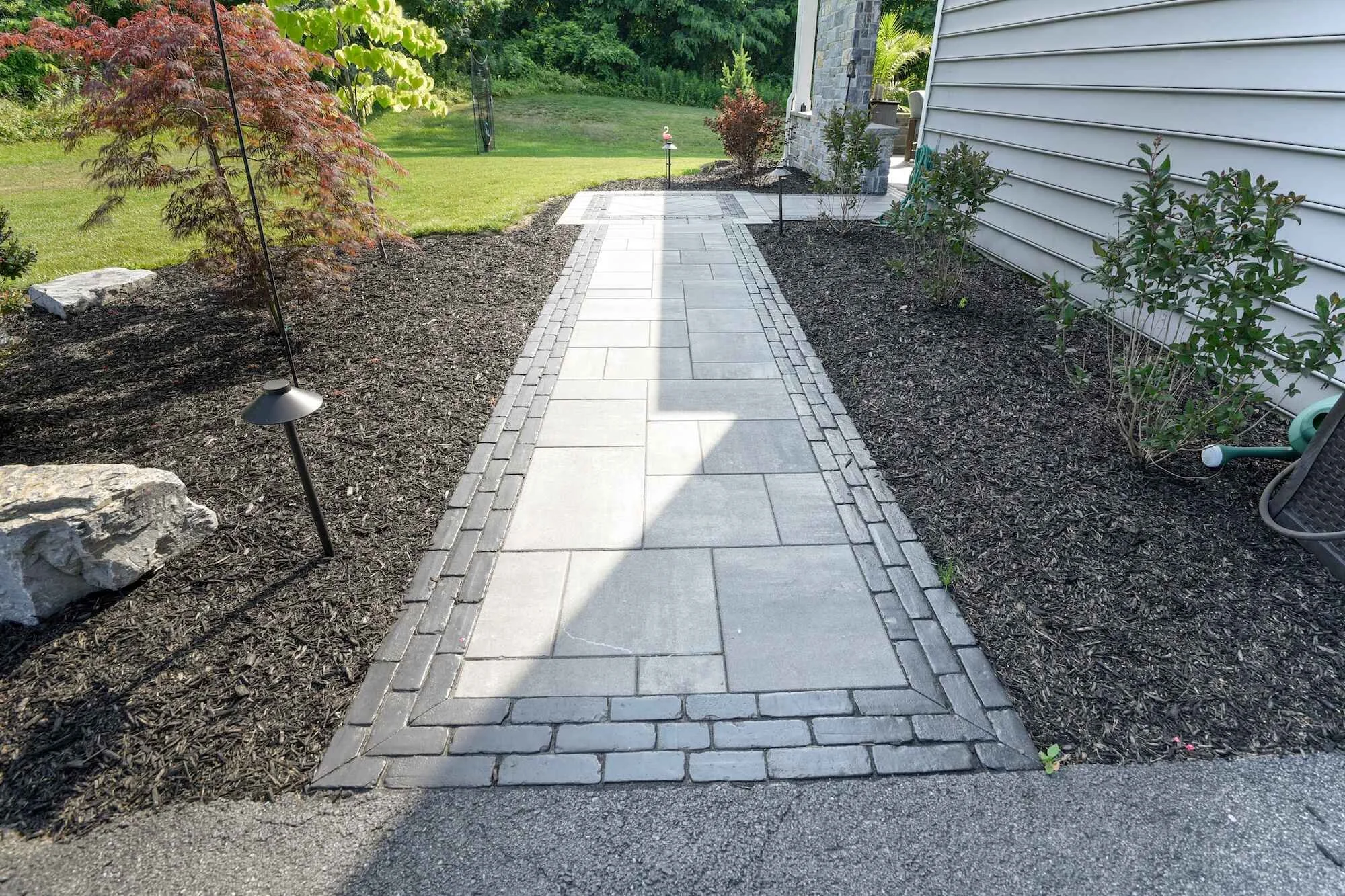 DESIGN | paver walkway | Natural stone PATIO | natural stone fireplace | custom woodgrain awning | PLANTINGs