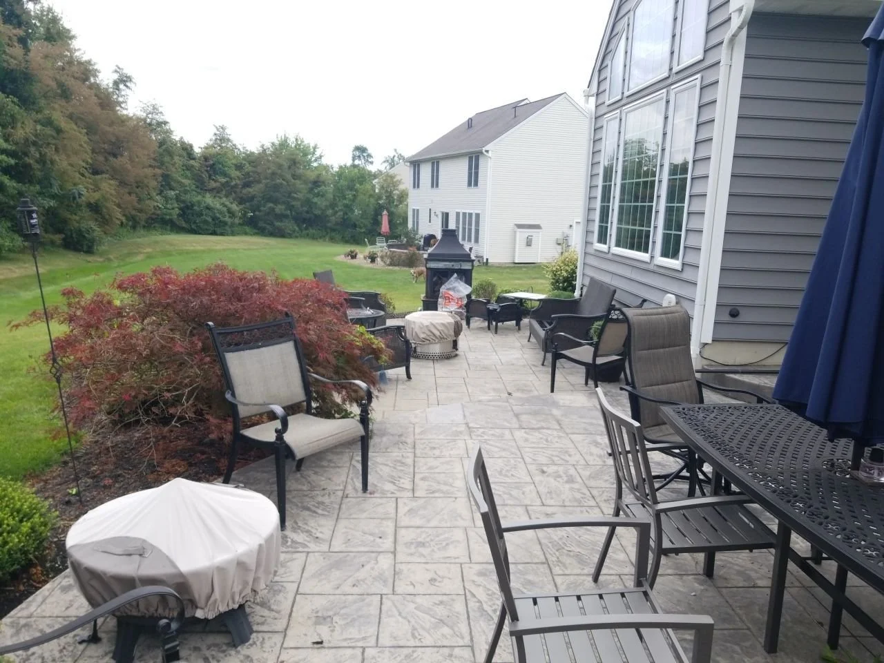 The project began with the creation of an elegant paver walkway that elevated the home's curb appeal and provided a sturdy path to the elevated stone patio. In the backyard, we designed a spacious paver and stone patio complete with a woodgrain awning for shade and weather coverage, as well as various seating areas, creating an ideal outdoor living space for relaxation. A large, inviting natural stone fireplace, and additional stone wall surround the large seating area to serve as a central gathering spot. We installed plant beds with premium mulch along the newly constructed patio area, filling them with a mix of native plants for continuous year-round interest. The result is a stunning and practical outdoor space that delighted the homeowners, highlighting our detailed planning and precise execution. The residence now boasts a breathtaking outdoor space that enhances the home's value and quality of life, showcasing the innovative and comprehensive approach of our landscaping team.