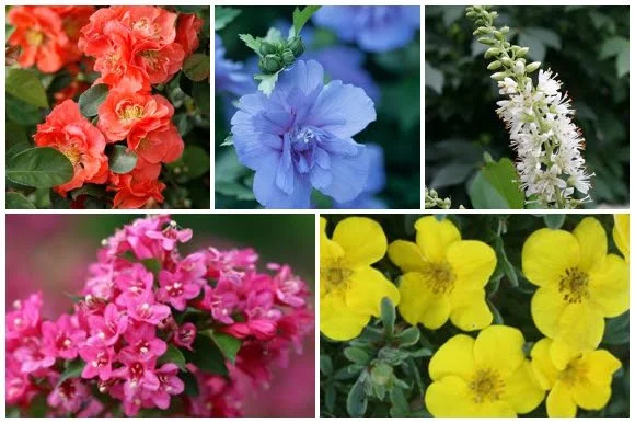Want non-stop garden color? With a little planning, your garden can be filled with color in every season with flowering shrubs like quince, rose of Sharon, summersweet, potentilla, and weigela (all pictured). Check out the full guide for bloom times, mature sizes, and light requirements to keep your landscape colorful all year long.