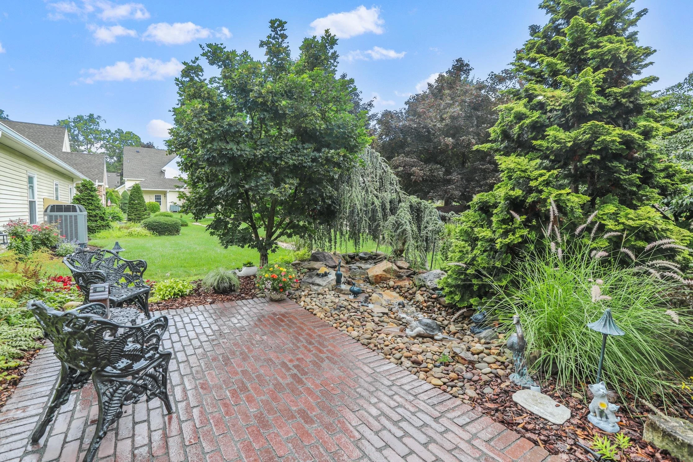 The walkway connecting the front and back of the home curves gently through garden beds filled with evergreens, flowering perennials, and ornamental grasses. A low stream adds sound and movement, and soft landscape lighting ensures the space remains usable long after sunset. Whether passing through or staying a while, this patio offers a quiet opportunity to connect with the surroundings and with the moment.