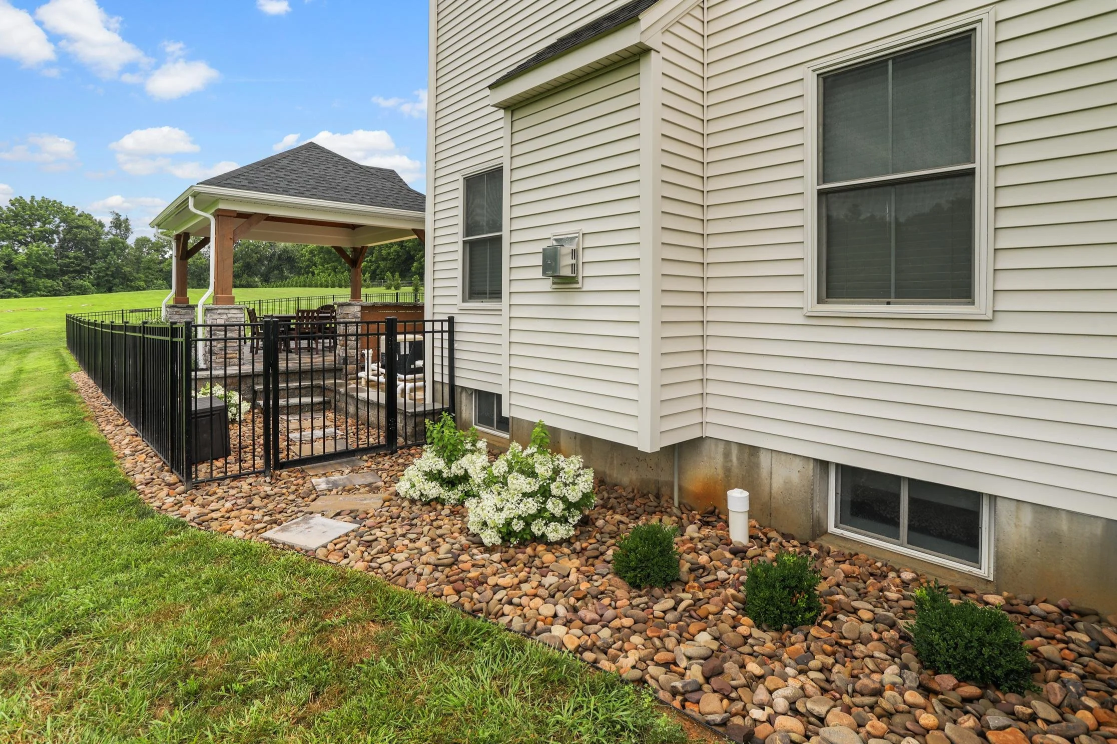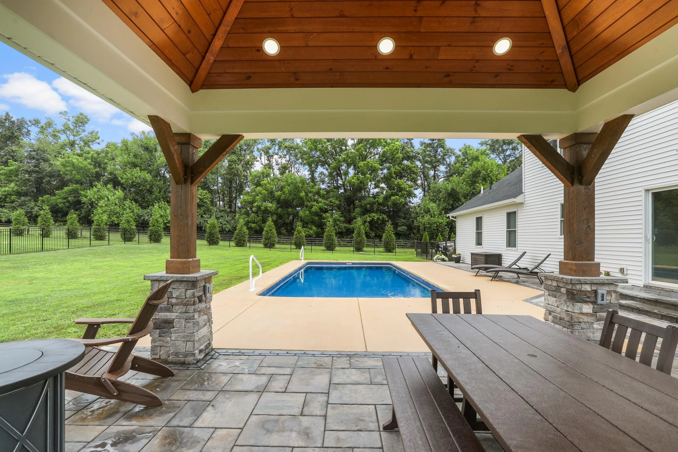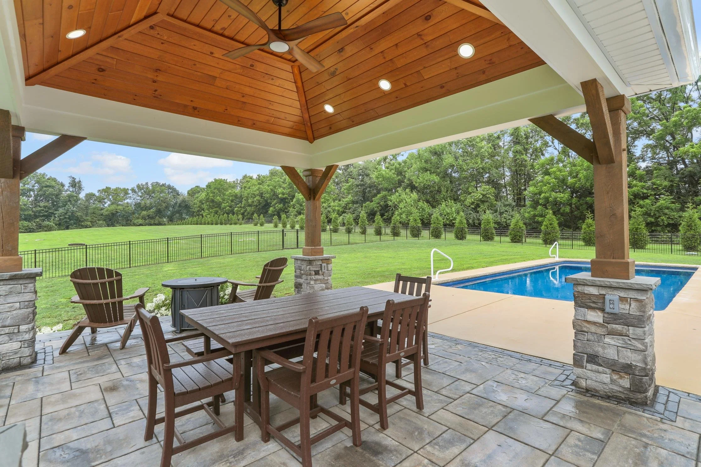At the heart of the design is a warm, timber-framed pavilion that offers shelter without shutting out the view. With stone-wrapped columns, soft outdoor lighting, and a ceiling fan tucked into the tongue-and-groove roof, it’s a true outdoor room comfortable in any weather, at any hour.