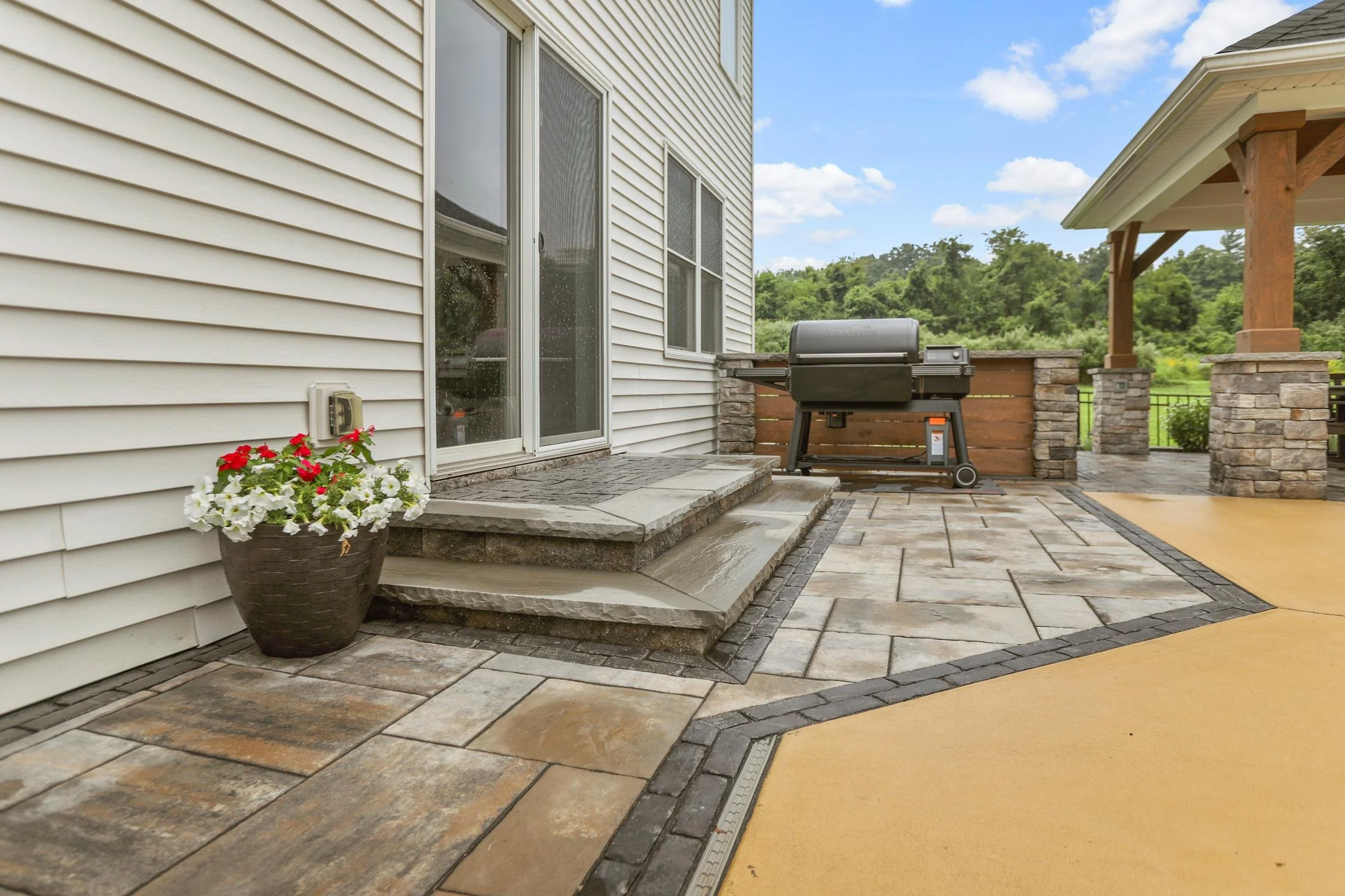 PAVER PATIO | PAVILION | GRILL STATION | PLANTING BED | STONE COLUMNS