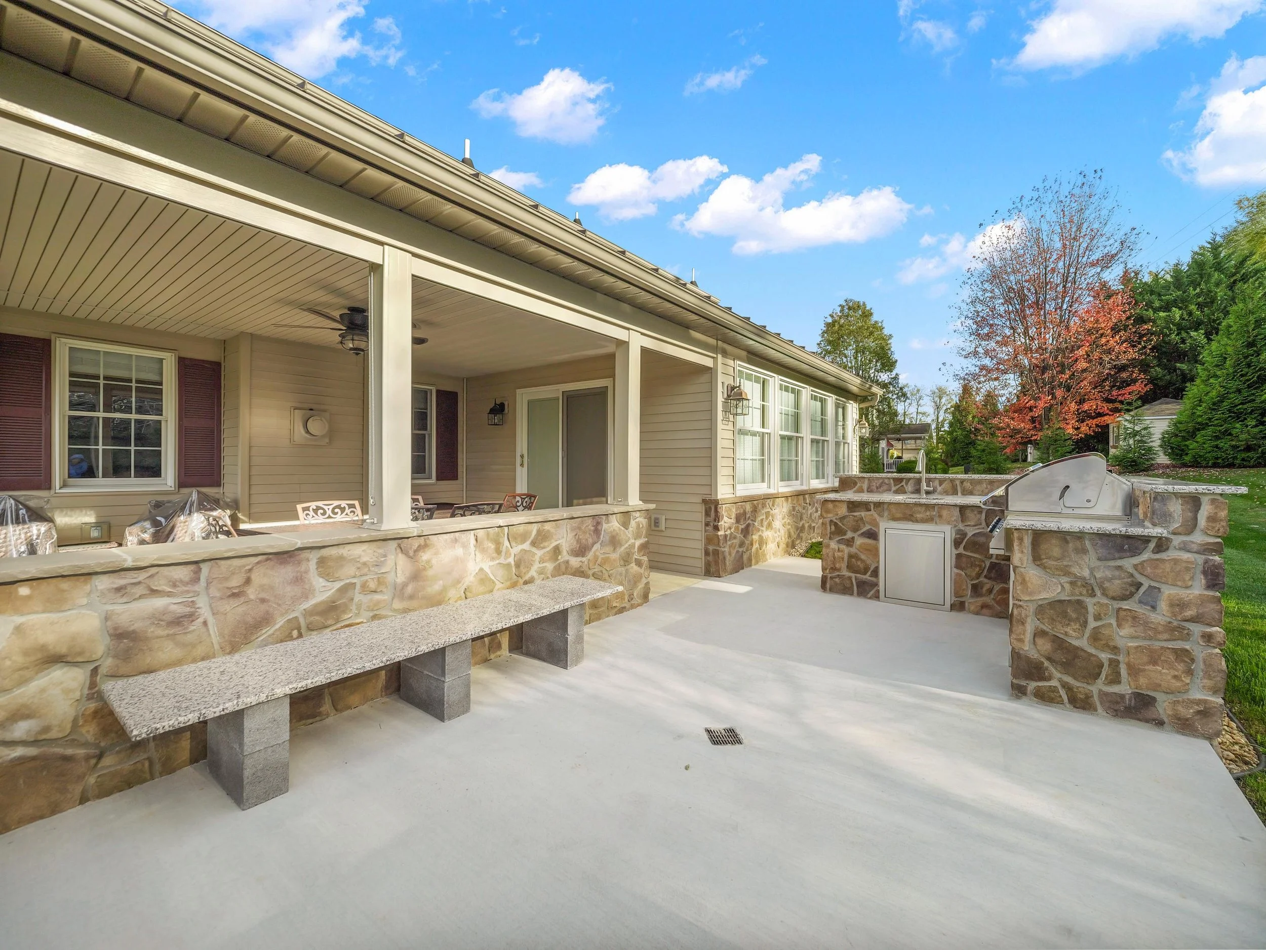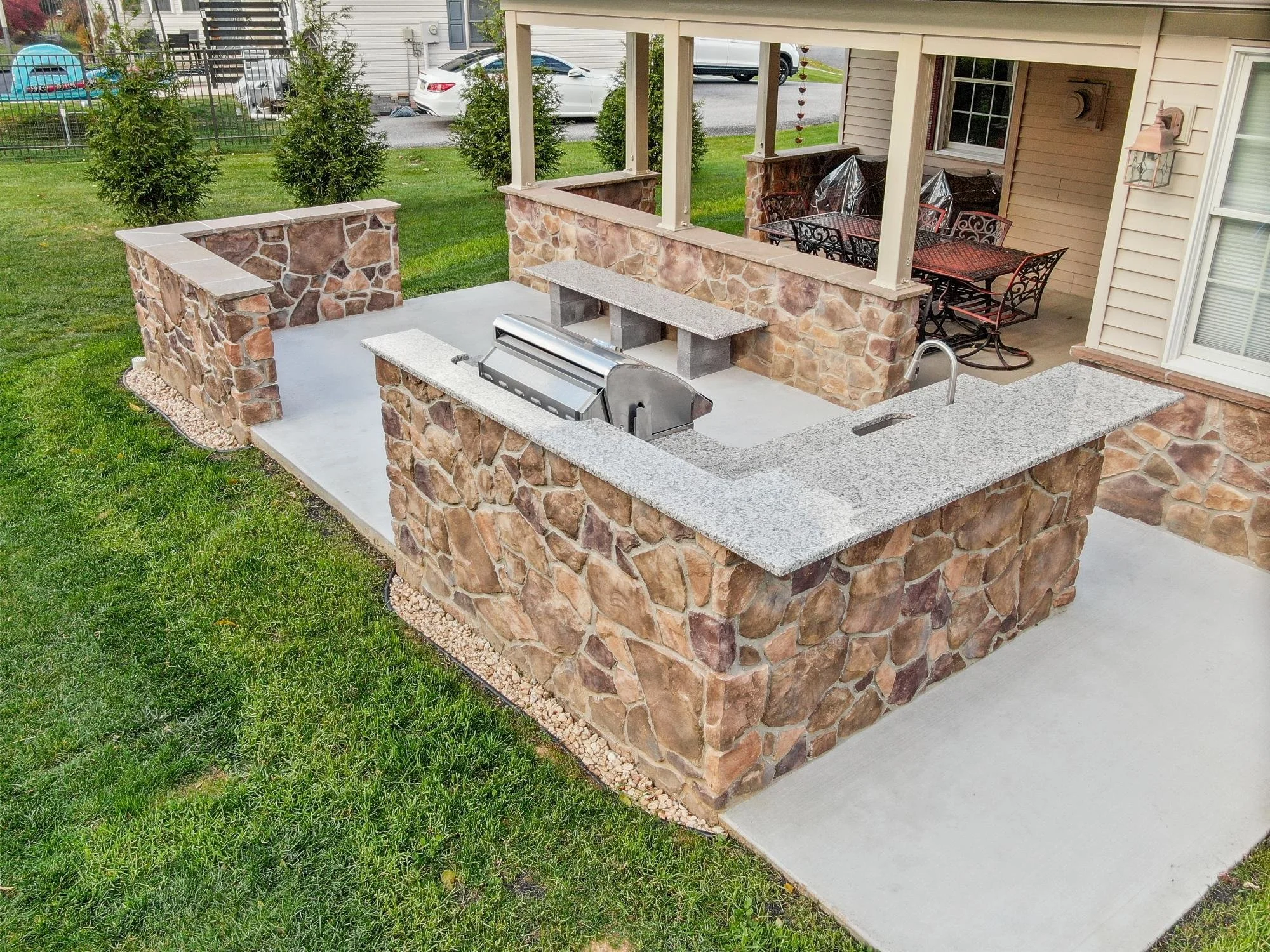 BUILT-IN GRILL | OUTDOOR KITCHEN | STONE SURROUND | NATURAL GRANITE BENCH | WRAPPED PATIO WALL | SPACIOUS CONCRETE PAD