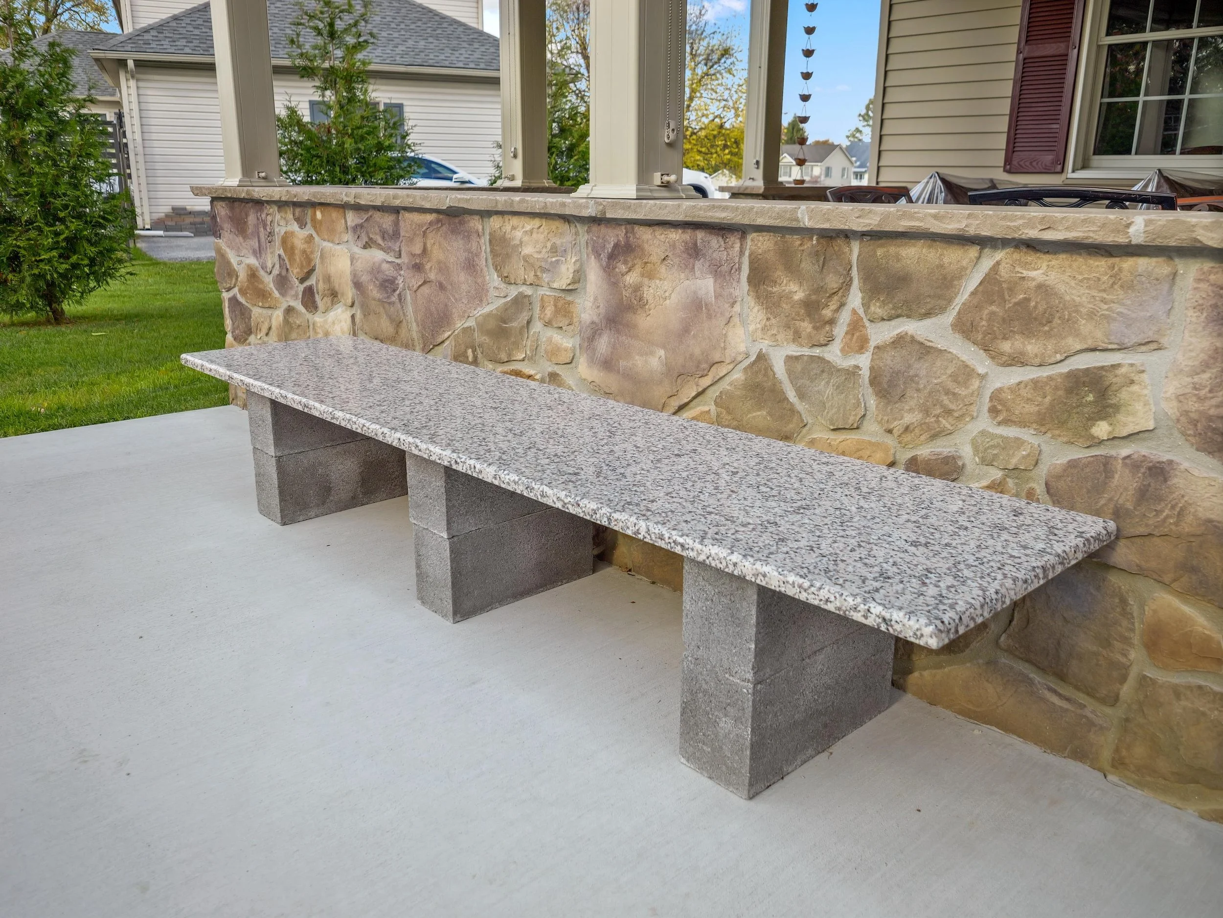 A custom granite bench adds visual interest and practical seating, sitting flush against the wall for a clean-lined aesthetic. The spacious concrete surface allows for movement, furniture, and easy maintenance. Every element is simple, elegant, and thoughtfully designed to offer lasting enjoyment without overwhelming the yard.